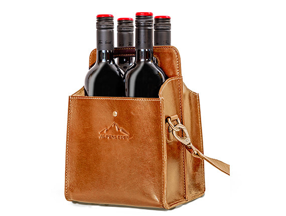 Der WEINVIERER ist eine edle Getränketasche aus Büffel-Sattlerleder von ALPENLEDER.