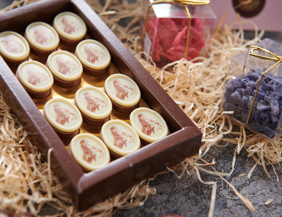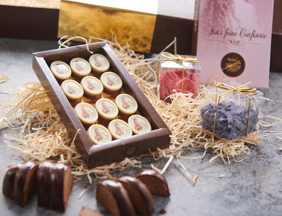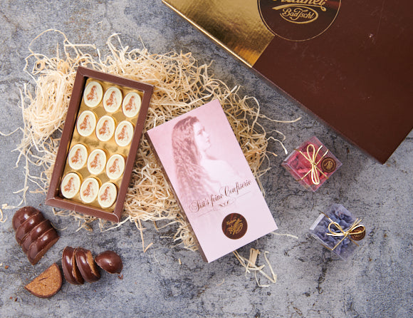 12 Pralinen aus zartschmelzender Canache mit Marzipan, Marc de Champagne und Weißwein, verziert mit dem Bildnis von Kaiserin Sisi.