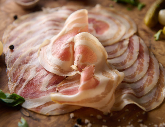 Pancetta geschnitten: Schweinefleisch, Kochsalz unjodiert, Gewürze, Zucker, Dextrose, Konservierungsstoff: Natriumnitrit.